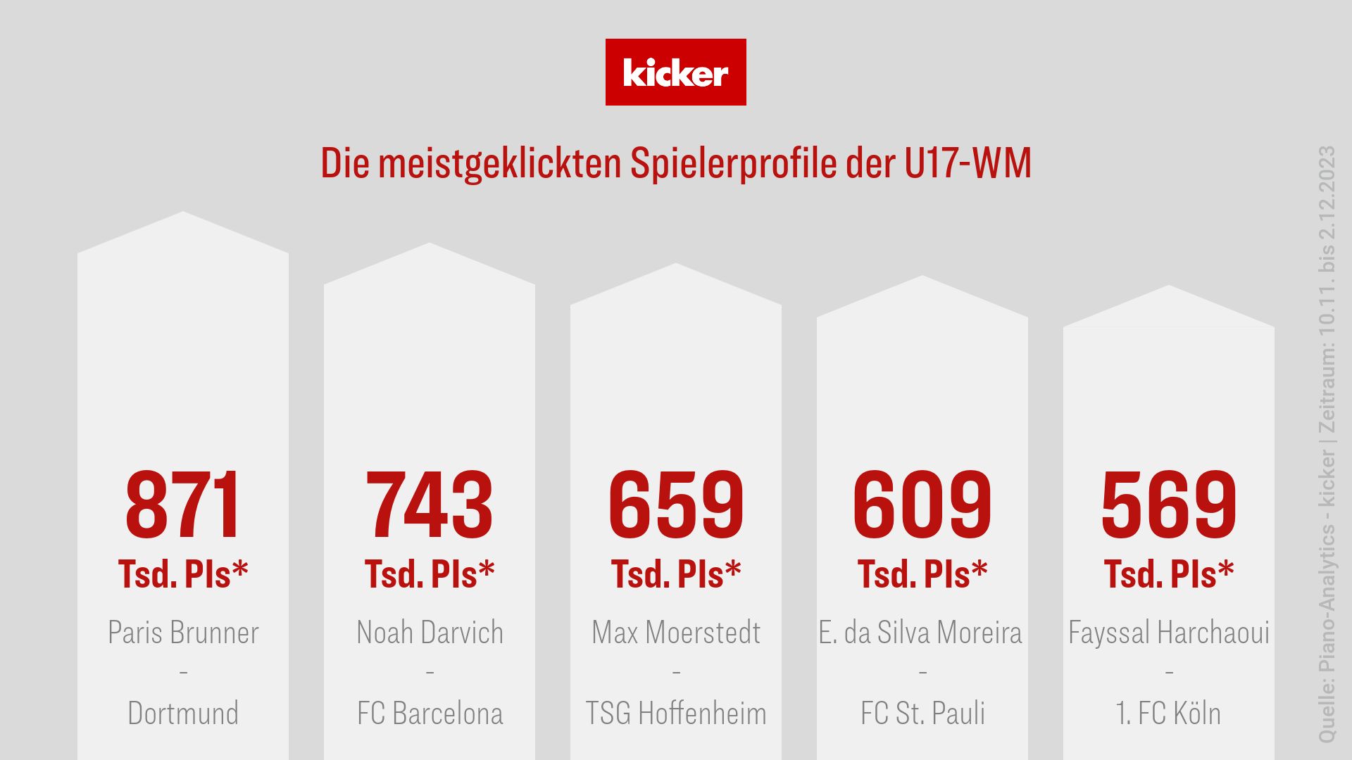 Der Gewinn des U17-WM-Titels durch das deutsche Team, angeführt vom Spieler des Turniers Paris Brunner, dem entscheidenden Elfmeterschützen Almugera Kabar und Trainer Christian Wück, brachte auf kicker.de und auf den Social-Media-Kanälen eine hohe Reichweite.