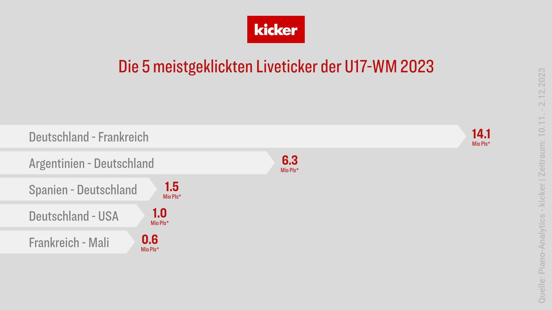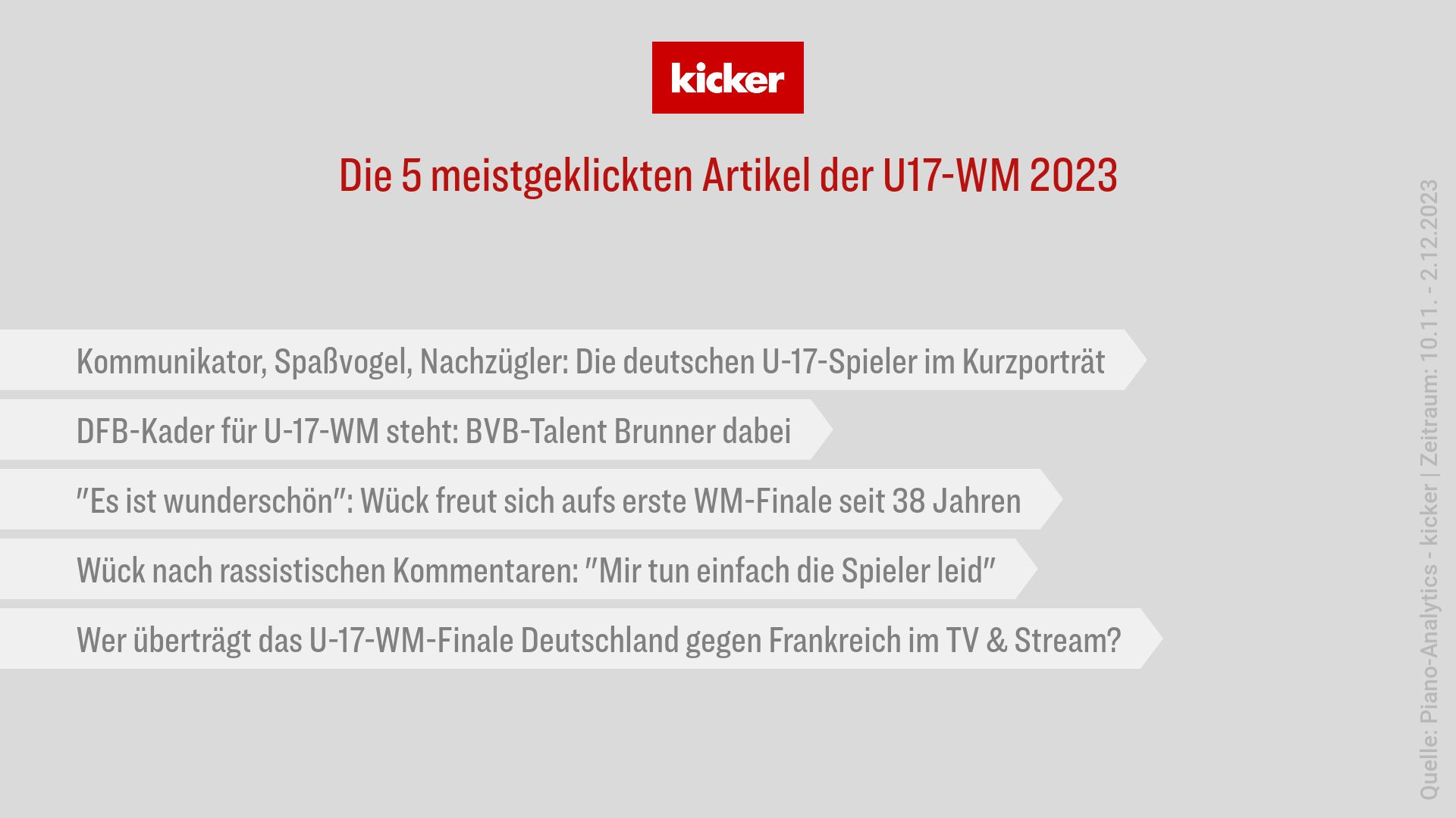 Der Gewinn des U17-WM-Titels durch das deutsche Team, angeführt vom Spieler des Turniers Paris Brunner, dem entscheidenden Elfmeterschützen Almugera Kabar und Trainer Christian Wück, brachte auf kicker.de und auf den Social-Media-Kanälen eine hohe Reichweite. Die Berichterstattung über das Event und die Spieler der Nationalmannschaft zog sogar noch mehr Interesse auf sich als der Europameister-Titel im vergangenen Sommer.